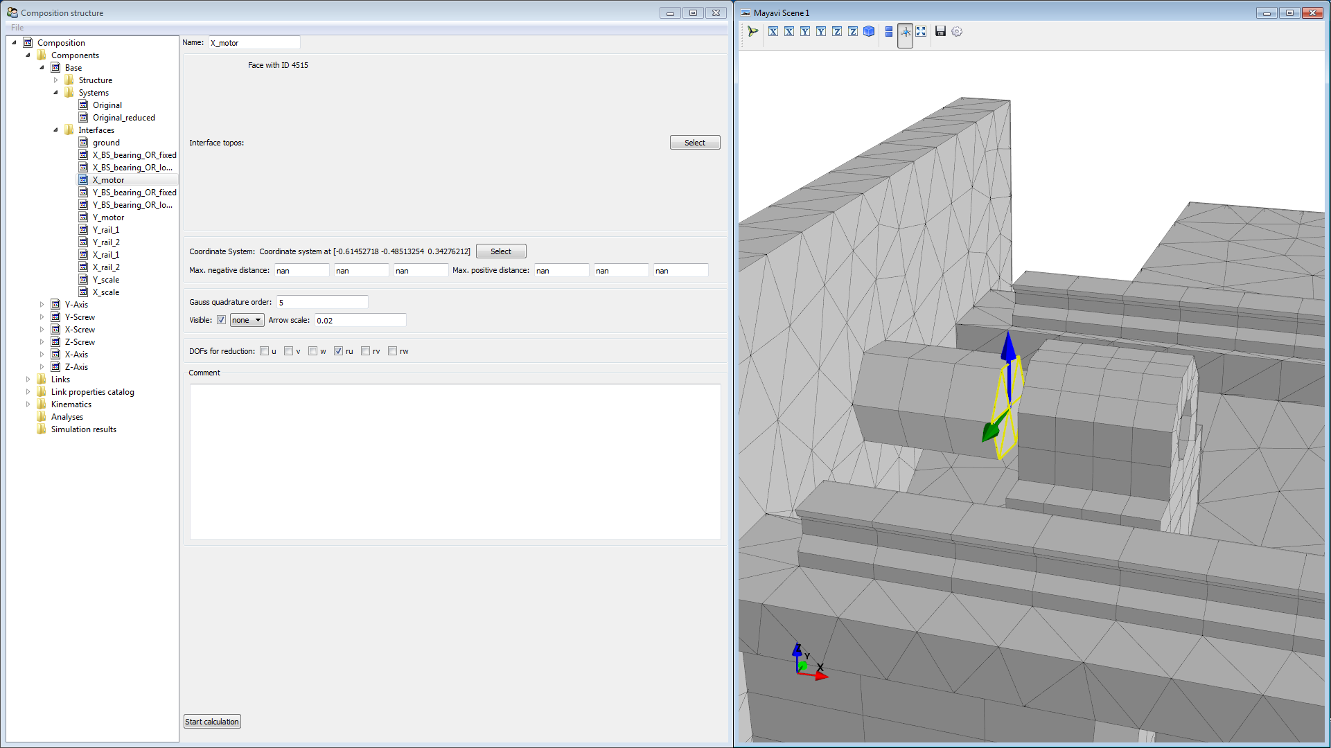 Create the interfaces for the Y-ball-screw bearings and the motor in the same way. Define the coordinate systems: axial(u) in y-direction, transversal (v) in negative x-direction, normal (w) in z-direction.