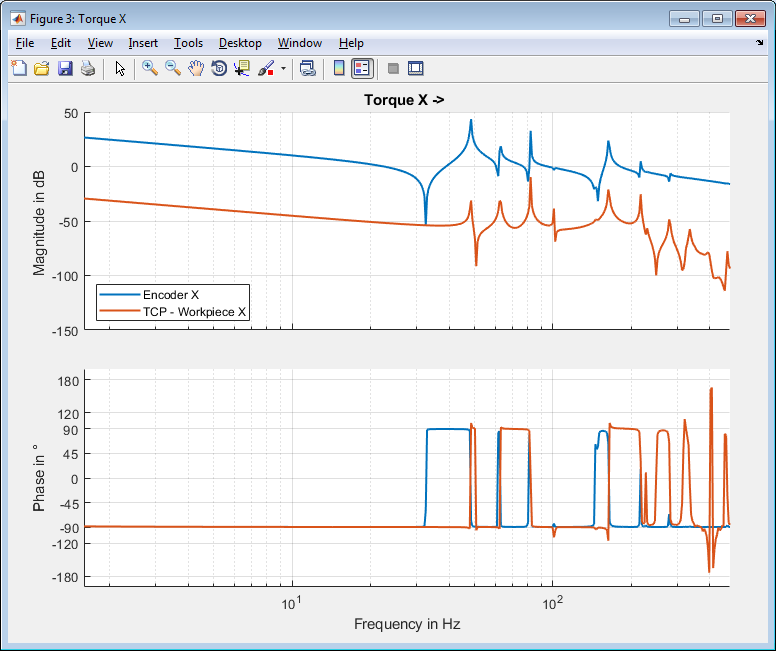 %% Create Bode Plots % Torque X -> figure('name','Torque X'); lin_model.bode('torque_x', 'x_encoder/2','labels',{'Encoder X'}) lin_model.bode('torque_x', 'tcp_workpiece/2(1)','labels',{'TCP - Workpiece X'},'colorIndex',2) legend show title('Torque X -> ') % Torque Y -> figure('name','Torque Y'); lin_model.bode('torque_y', 'y_encoder/2','labels',{'Encoder Y'}) lin_model.bode('torque_y', 'tcp_workpiece/2(2)','labels',{'TCP - Workpiece Y'},'colorIndex',2) legend show title('Torque Y -> ') % Torque Z -> figure('name','Torque Z'); lin_model.bode('torque_z', 'z_encoder/2','labels',{'Encoder Z'}) lin_model.bode('torque_z', 'tcp_workpiece/2(3)','labels',{'TCP - Workpiece Z'},'colorIndex',2) legend show title('Torque Z -> ')
