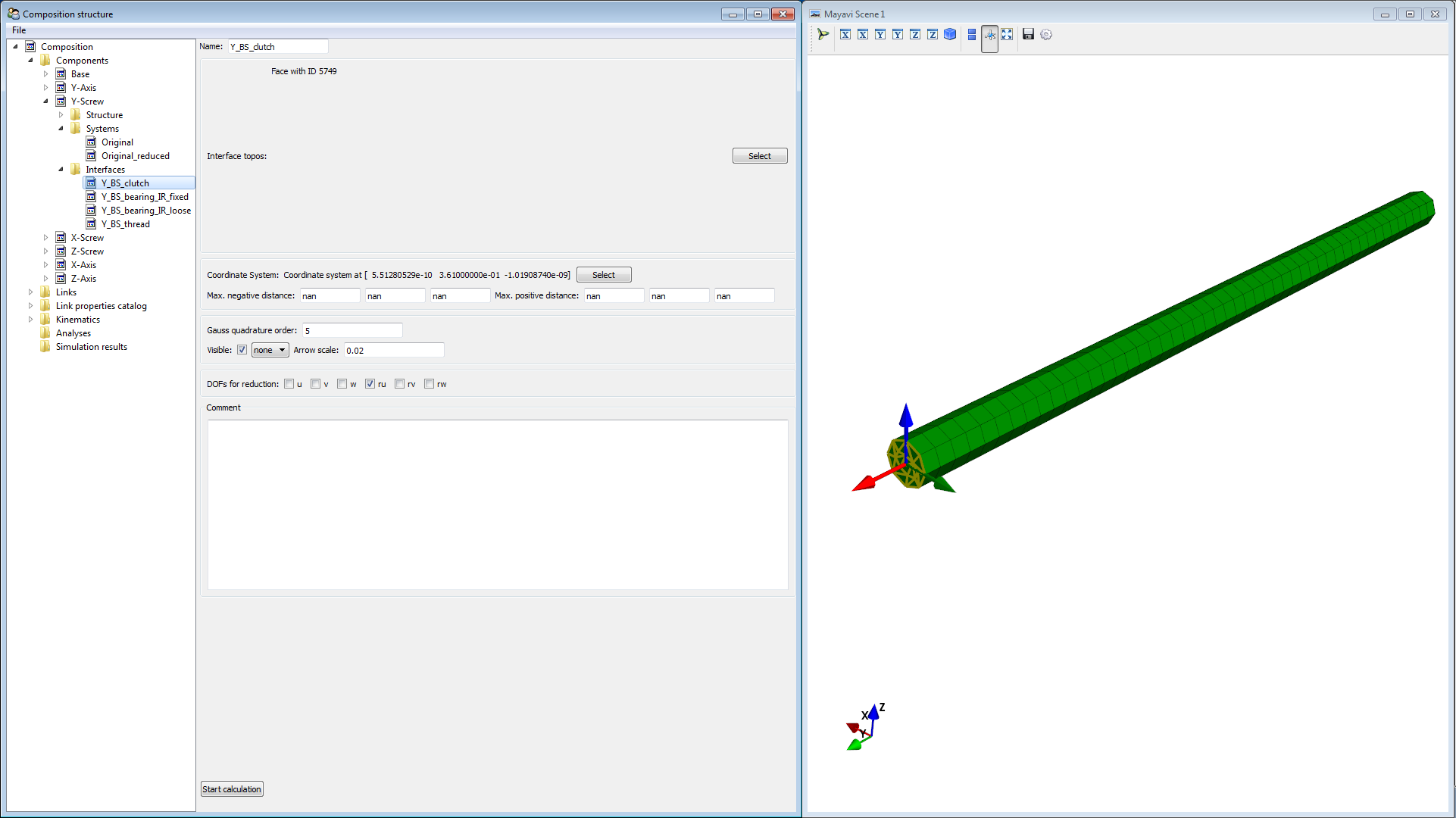 Since the nut will transmit forces in u (axial) direction and torque in ru direction only, we deselect the other direction from DOFs for reduction. Rename it to Y_BS_nut.