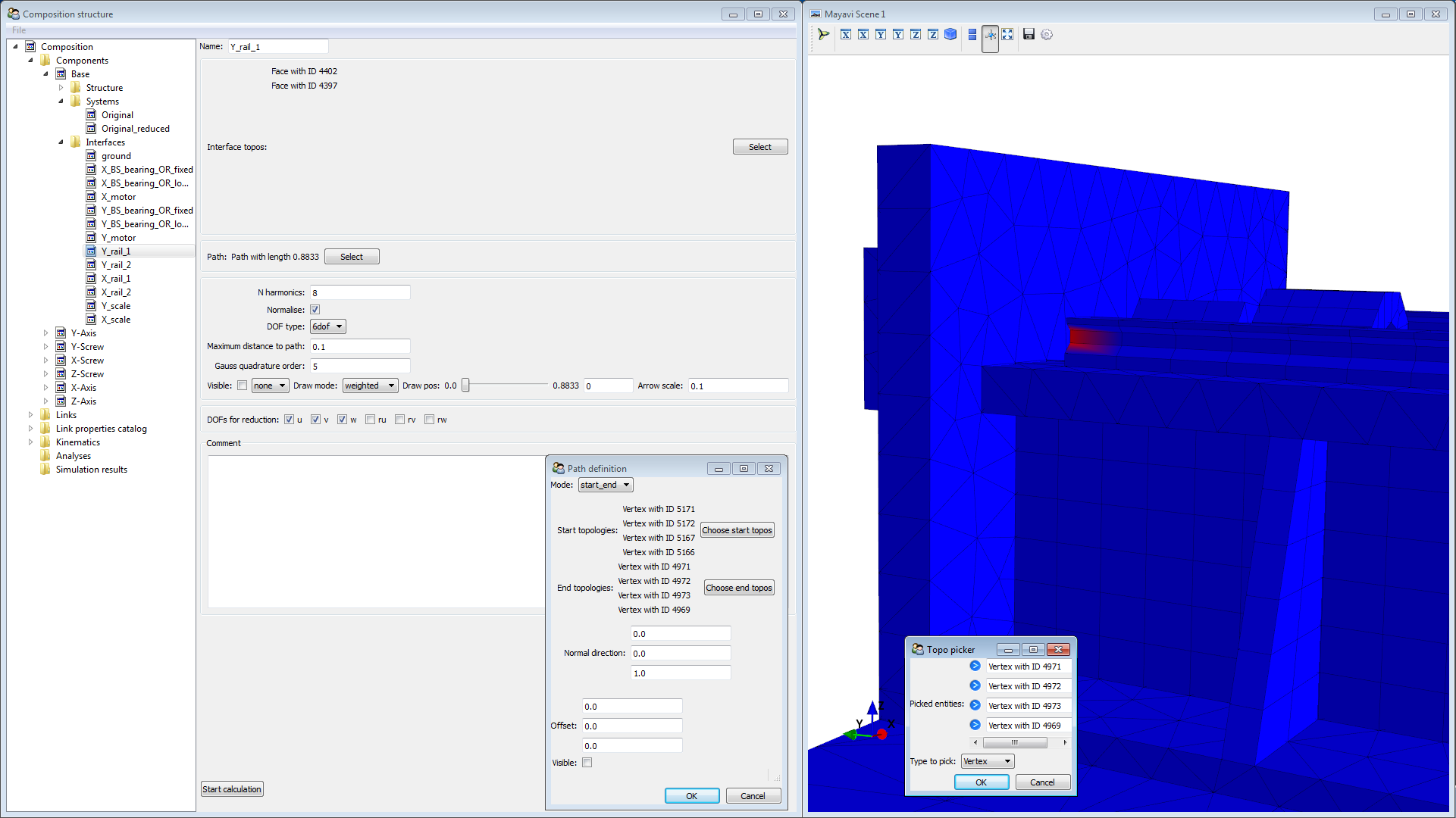 Enter a value for N harmonics. This setting “divides” the path into smaller pieces. One piece should approximately have the length of the carriage. Thus we enter 8. The other setting we leave on default. Select u, v, w in DOFs for reduction. Then click Start calculation. This will take a few minutes.