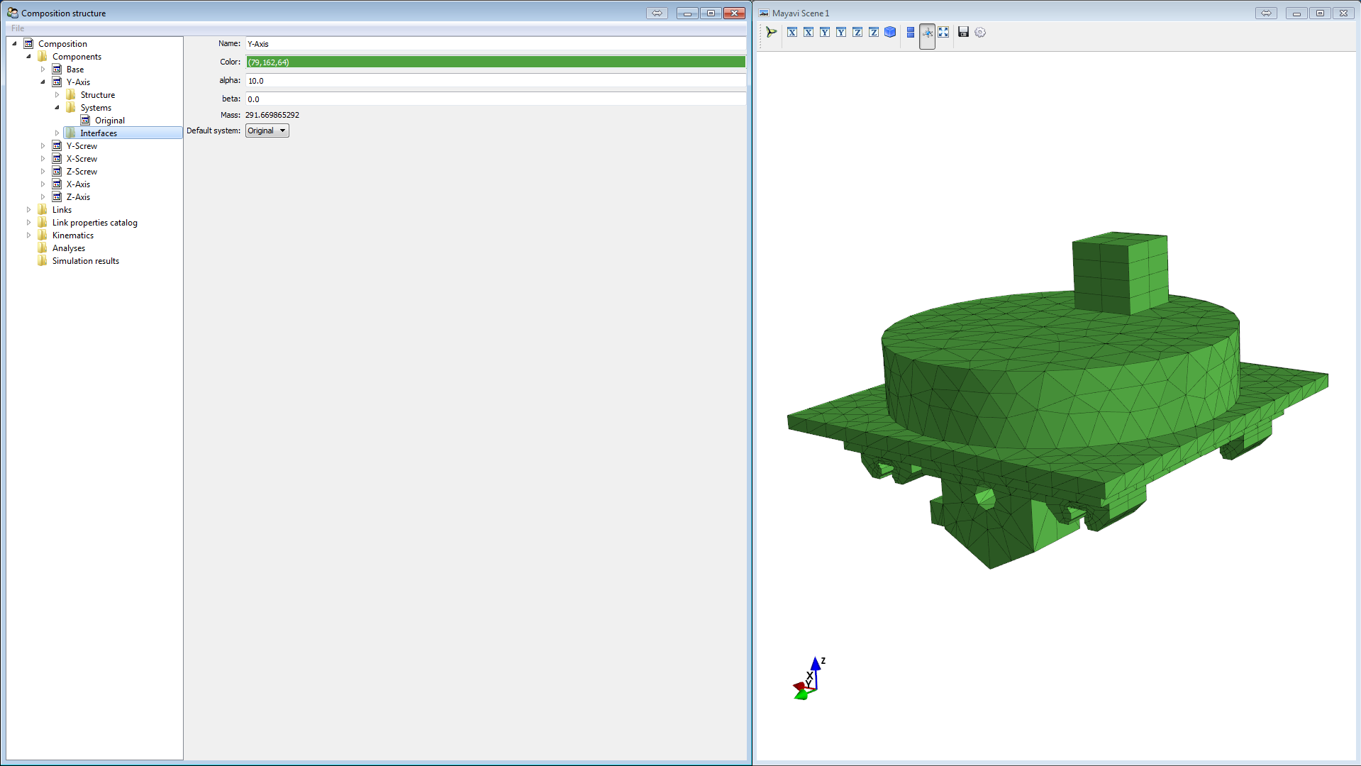 Create the interfaces for the Y-ball-screw bearings and the motor in the same way. Define the coordinate systems: axial(u) in y-direction, transversal (v) in negative x-direction, normal (w) in z-direction.