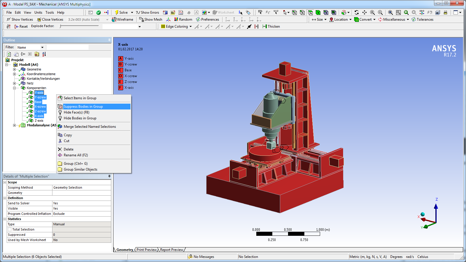Now open ANSYS Mechanical by double clicking on the Model Tab of the modal analysis. Now we need to divide the machine model into components. A component consists of all bodies, that move together as e.g. an axis or the machine basis. This results in a component for each axis and one for the base. If ball screws are used for the axis movement, a separate component for each ball screw spindle has to be created. Select all moving bodies of the Y-axis. Open the context menu by right click and select Create Named Selection and name it Y-axis. Repeat this step for all axes (and ball screw spindles).