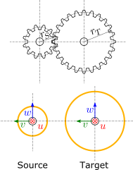 Aligned with the v-direction of the source gear, pointing from the target to the source gear |